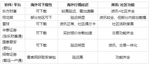 ● App下载问题:部分券商 App 在海外商店可直接下载(如华泰“涨乐财富通”、国泰君安“君弘”),但也有一些需要手动更新或官网获取。
